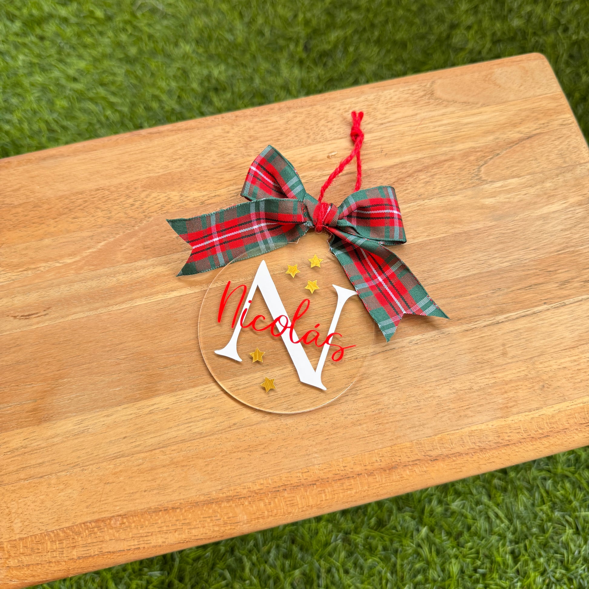 Adorno de metacrilato con lazo tartán e inicial personalizada, grabado con vinilo. Tamaño: 8 cm. Un detalle único y elegante para regalar o decorar, totalmente personalizable con el nombre que quieras.