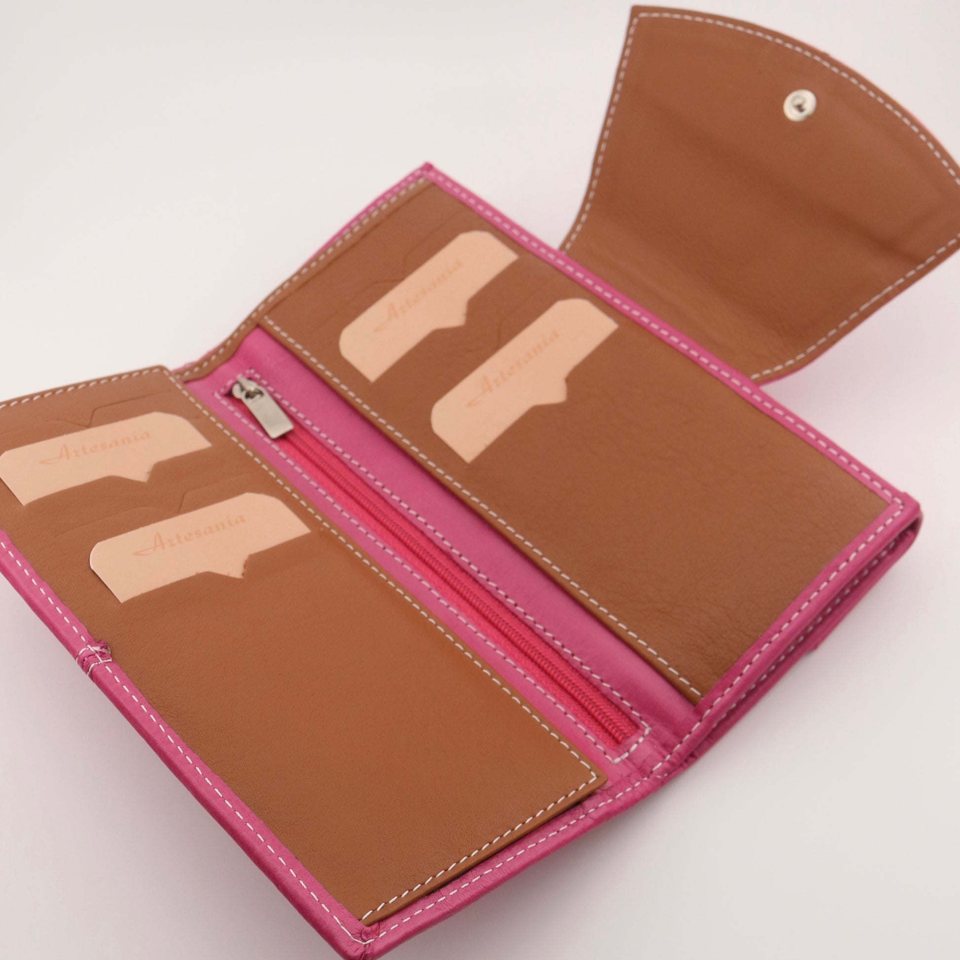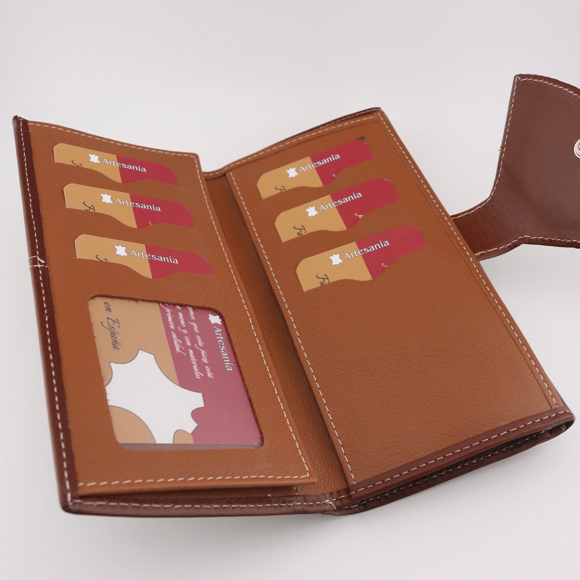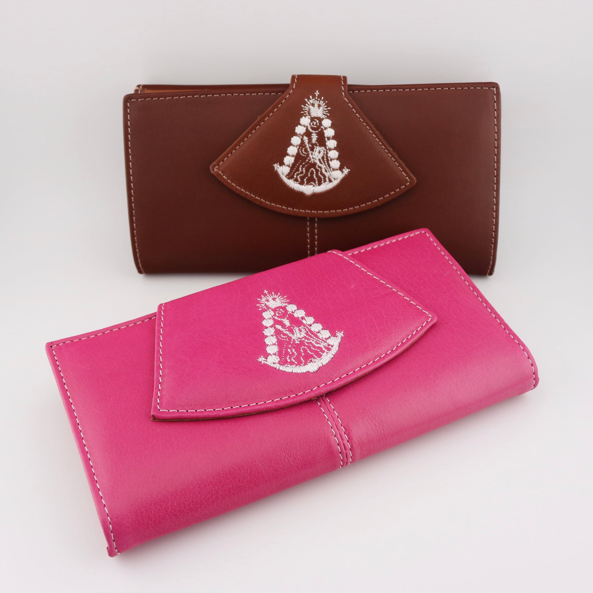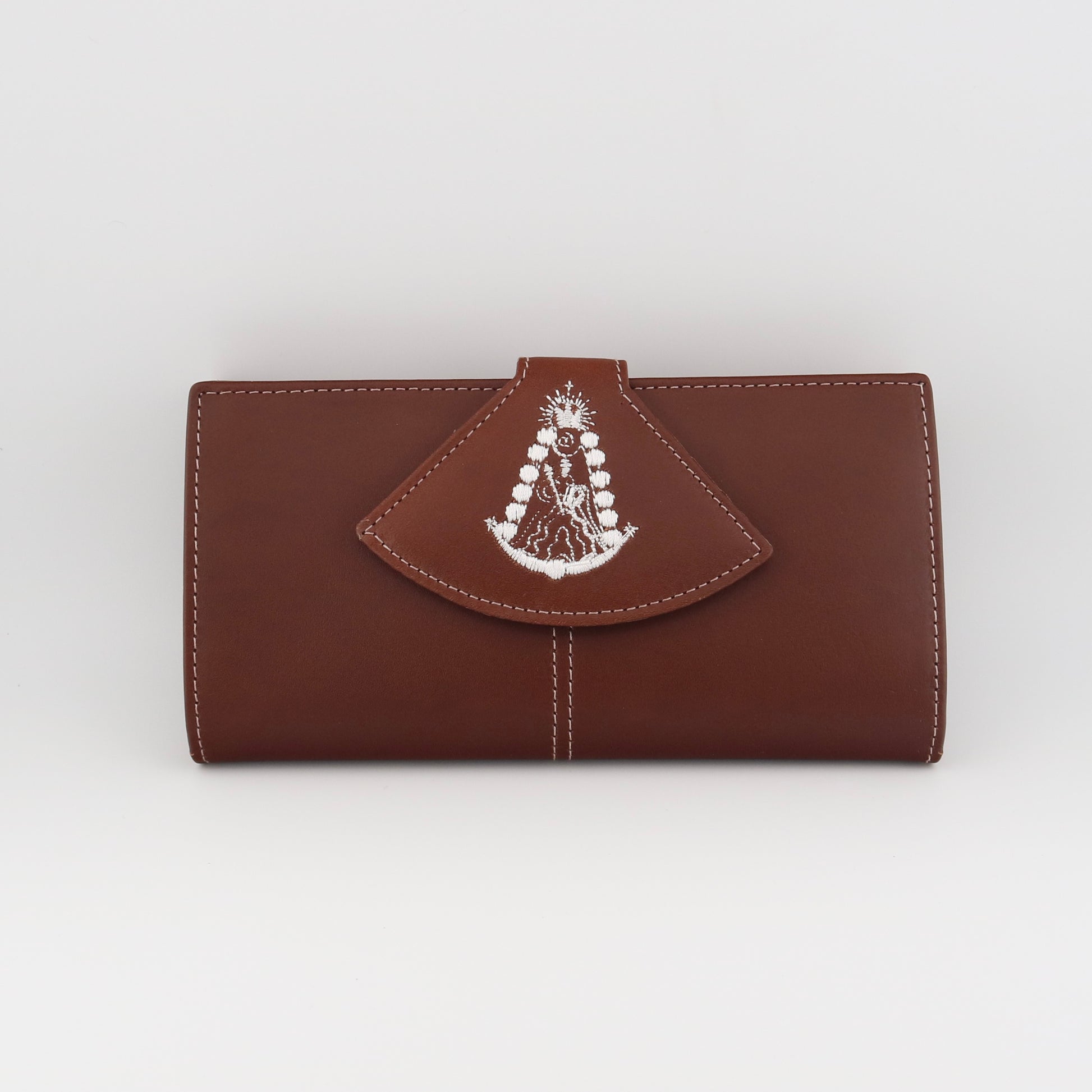 Billetera con bordado de la Virgen del Rocío en la solapa. Auténtica piel de Ubrique y fabricada en España. Lleva en su interior cremallera y varios compartimentos para tarjetas. Disponible en color capote y marrón.