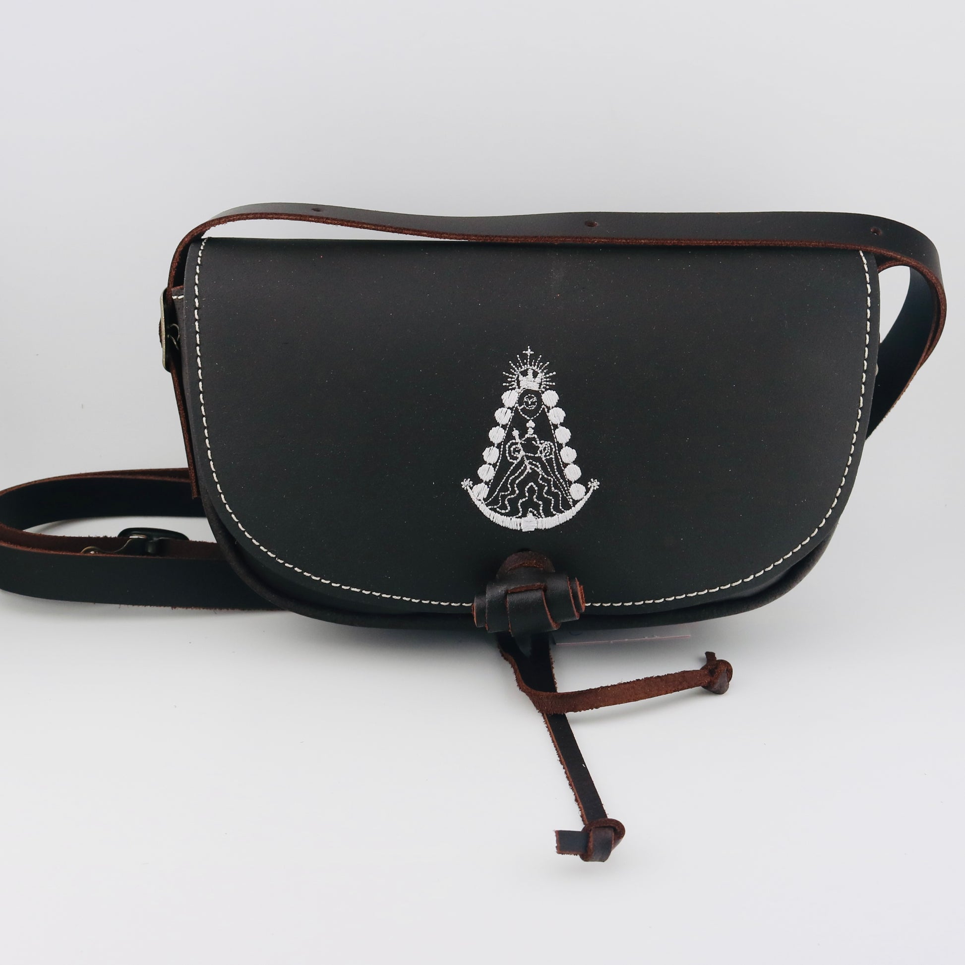 Bolso bandolera en color wengué fabricado en auténtica piel. Lleva bordada en la solapa la silueta de la virgen del Rocío. Se puede colgar como bolso, bandolera o riñonera. Fabricado en España.