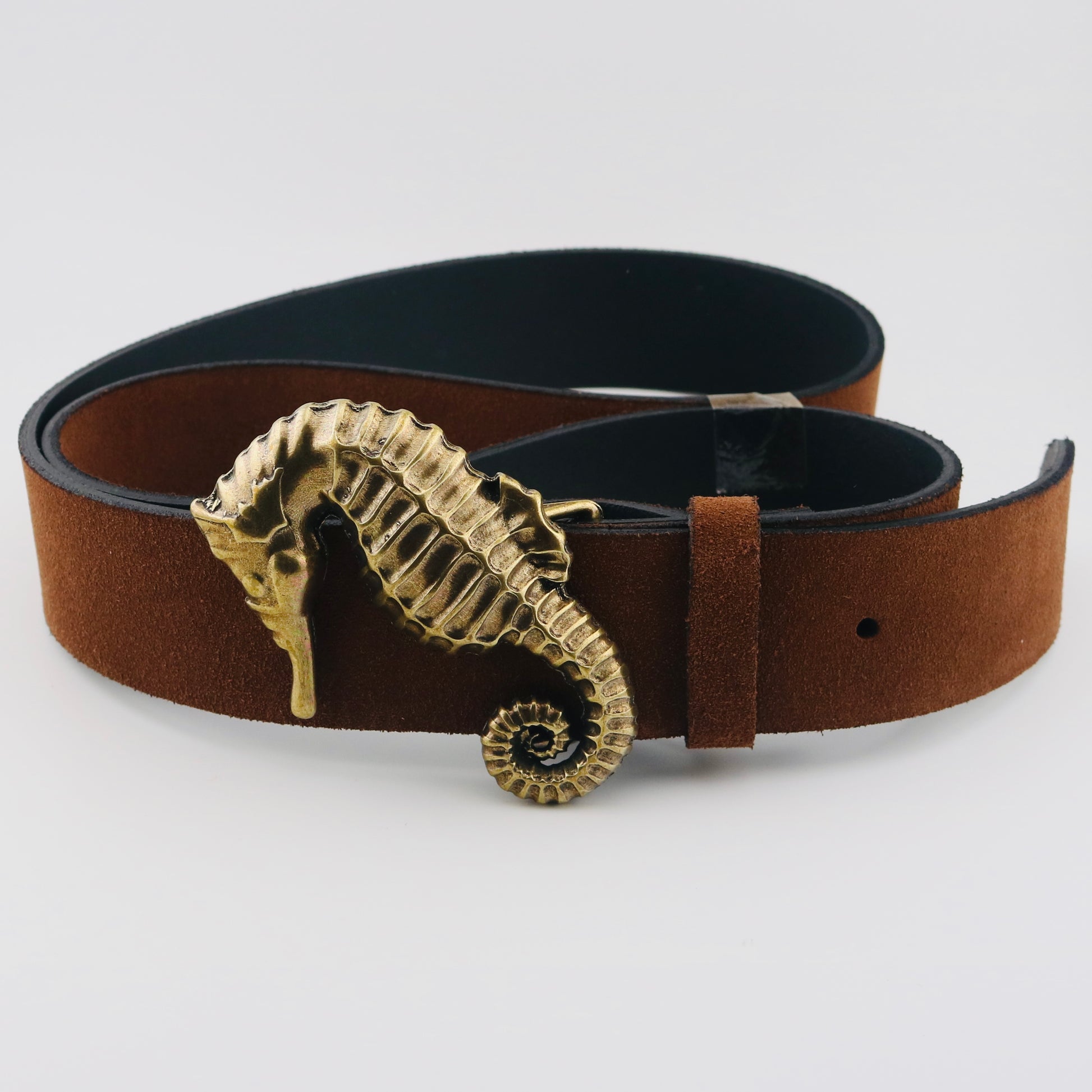 Cinturón en piel de ante en color marrón fabricado en España. Lleva una hebilla con forma de caballito de mar que lo hace muy especial. Elige tu talla en la cajita de notas al finalizar el pedido.