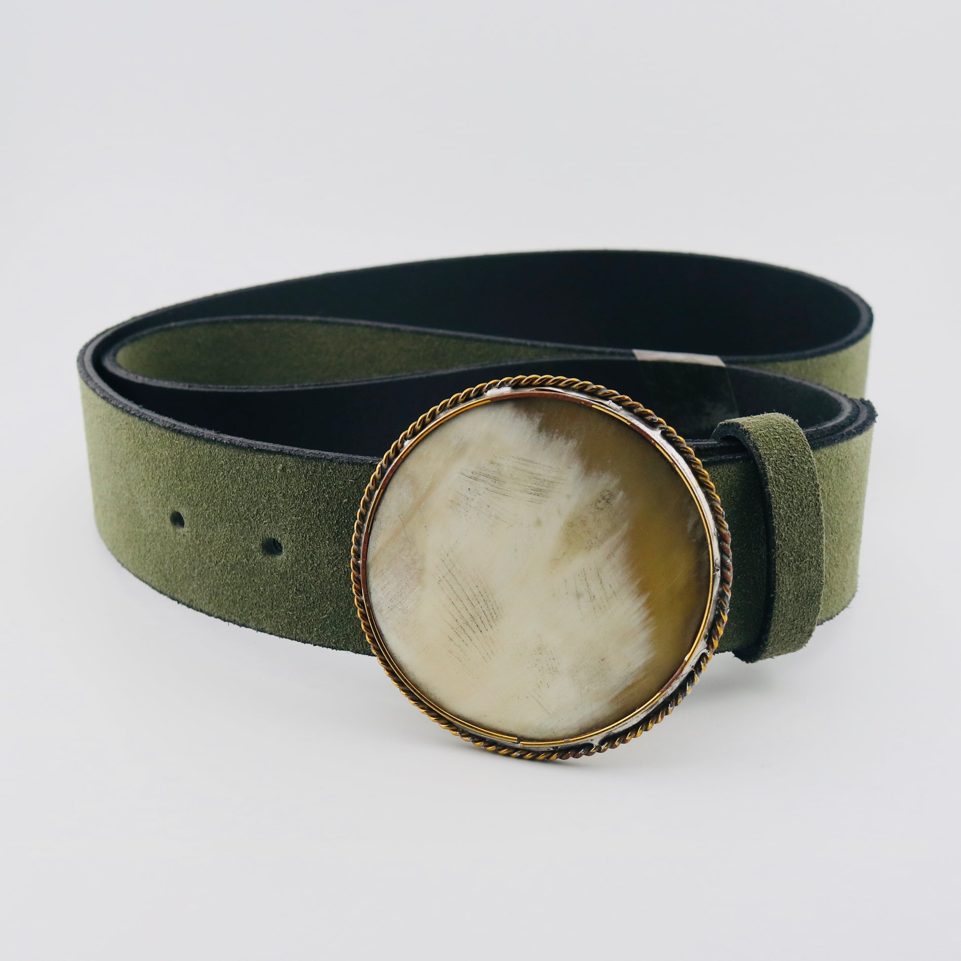 Cinturón en piel de ante en color verde con hebilla de nácar haciendo juego. Elige tu talla en la cajita de notas al finalizar el pedido.