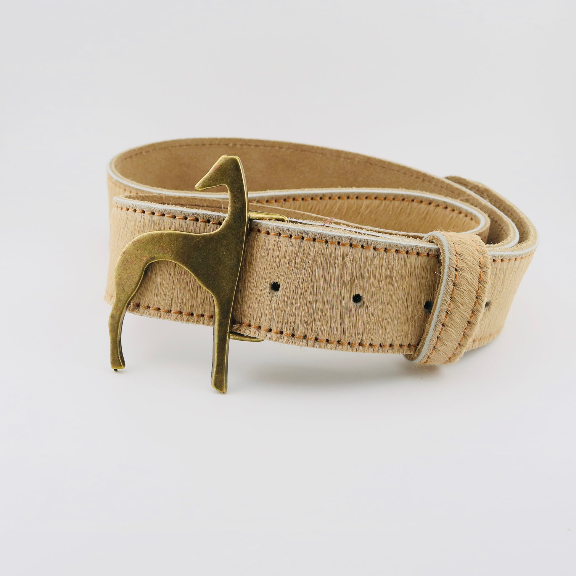Cinturón de piel suave con pelito en tono beige clarito. Lleva una hebilla con forma de galgo. Elige tu talla en la cajita de notas al finalizar el pedido.