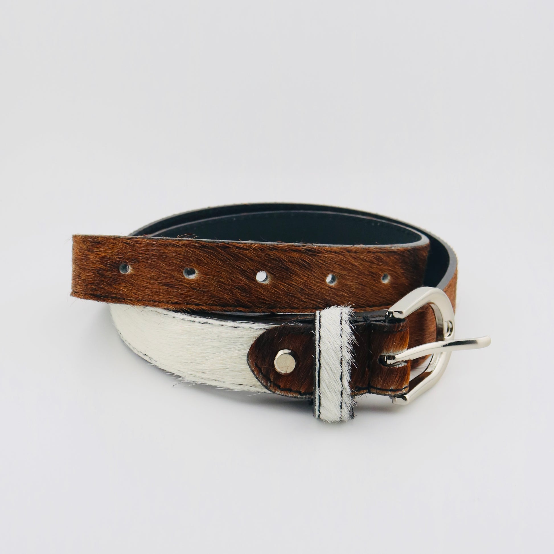 Cinturón de piel de potro, fabricado en España, con estampado en tonos marrones y claros. Lleva cierre de hebilla y sus medidas son 2,5 cm de ancho y 1 mtr aproximadamente.