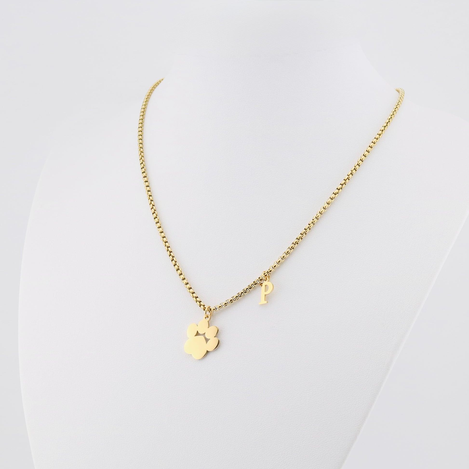 Collar dorado fabricado en Acero Inoxidable. Lleva como adorno una huella de perrito y también la inicial de tu mascota. Sólo tienes que decirnos en la nota del pedido, la inicial que quieres. Si por falta de stock no tuviéramos la inicial elegida, nos pondremos en contacto contigo para buscar una solución.