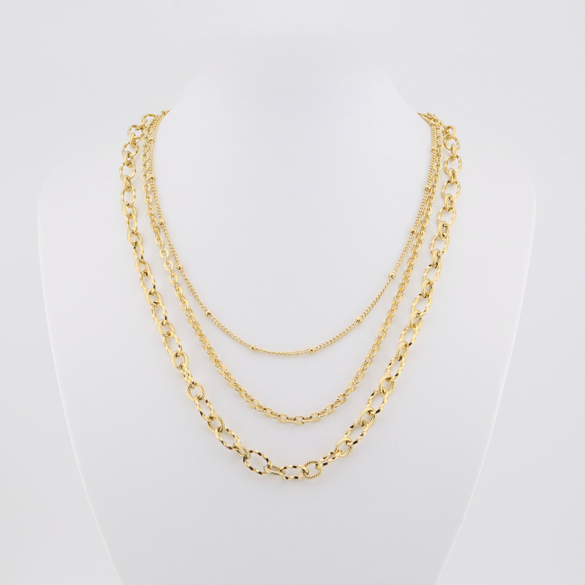 Collar triple con tres tipos de cadena en color dorado. Lleva cierre trasero de langosta y sus medidas son de 43 cms aprox. Material Acero Inoxidable.