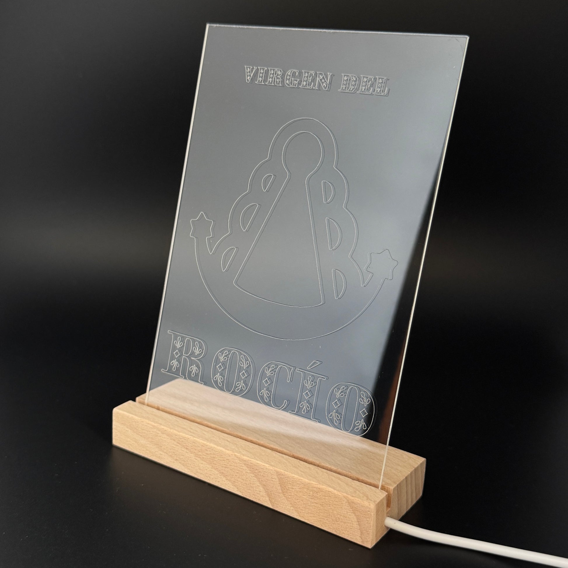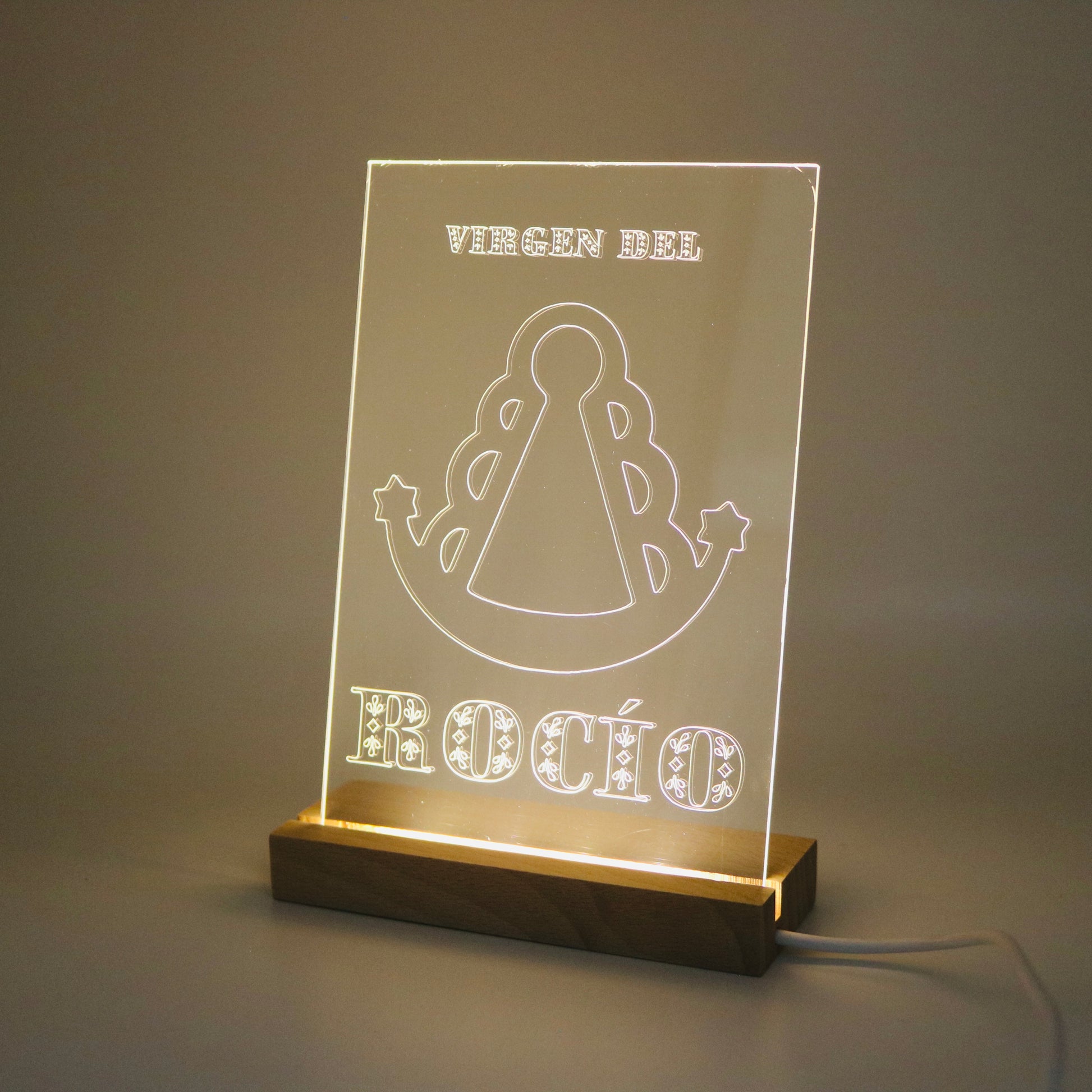 Lámpara decorativa con luz tenue ideal para la noche, con la imagen de la Virgen del Rocío grabada en metacrilato. Al encenderla, la silueta se ilumina suavemente gracias al reflejo de la luz, creando un ambiente cálido y acogedor. Luz cálida. Funciona mediante cable USB.