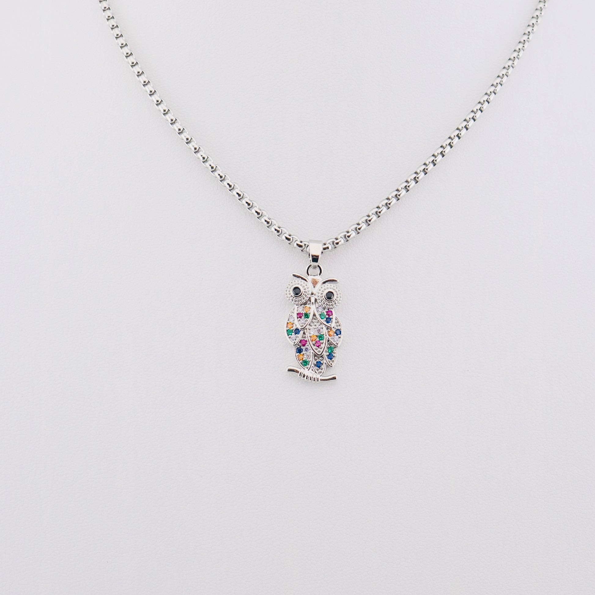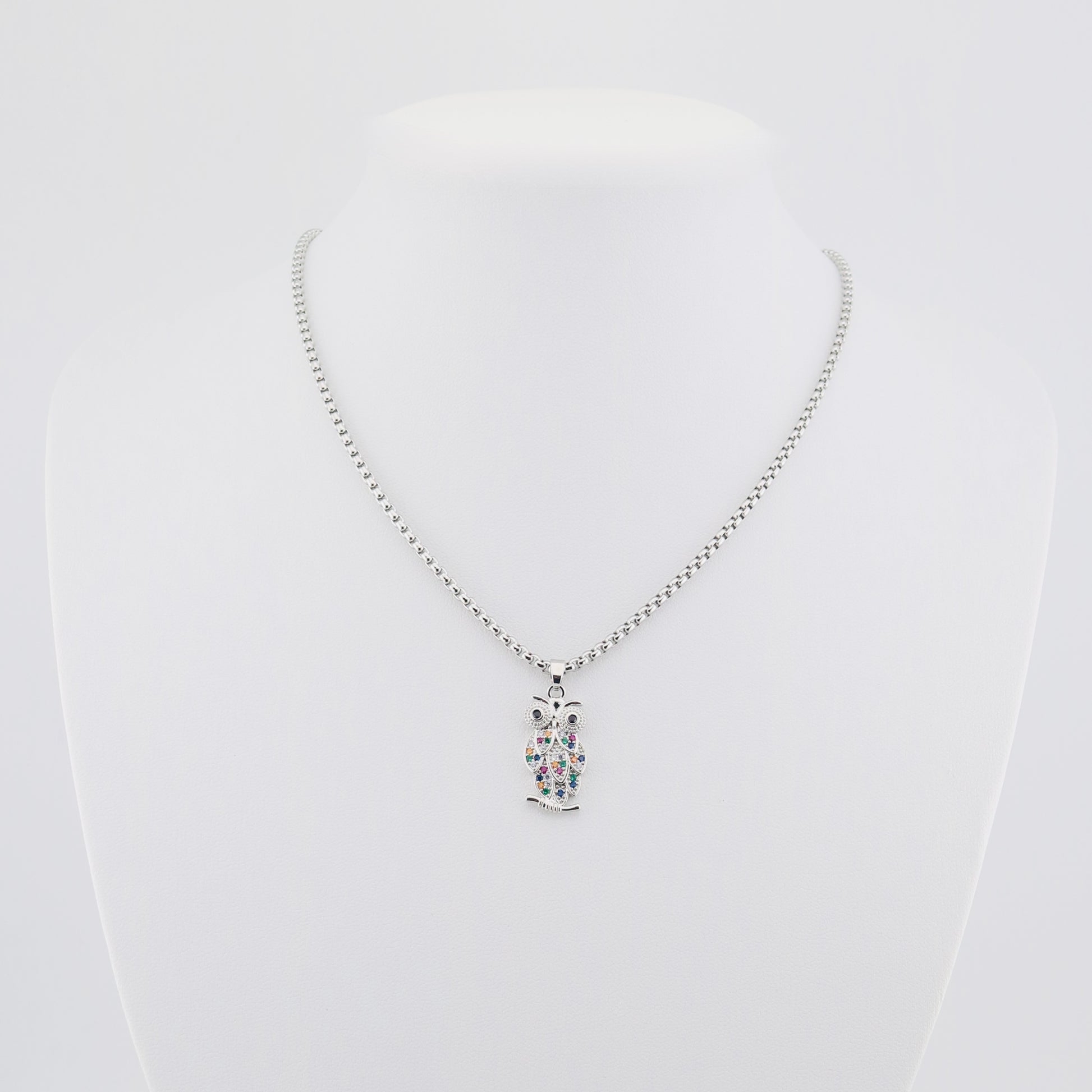 Collar plateado de acero inoxidable con cierre trasero de langosta. Lleva como adorno un búho con circonitas de colores. Los búhos son considerados símbolos de la sabiduría. Medidas 40 cms aprox.