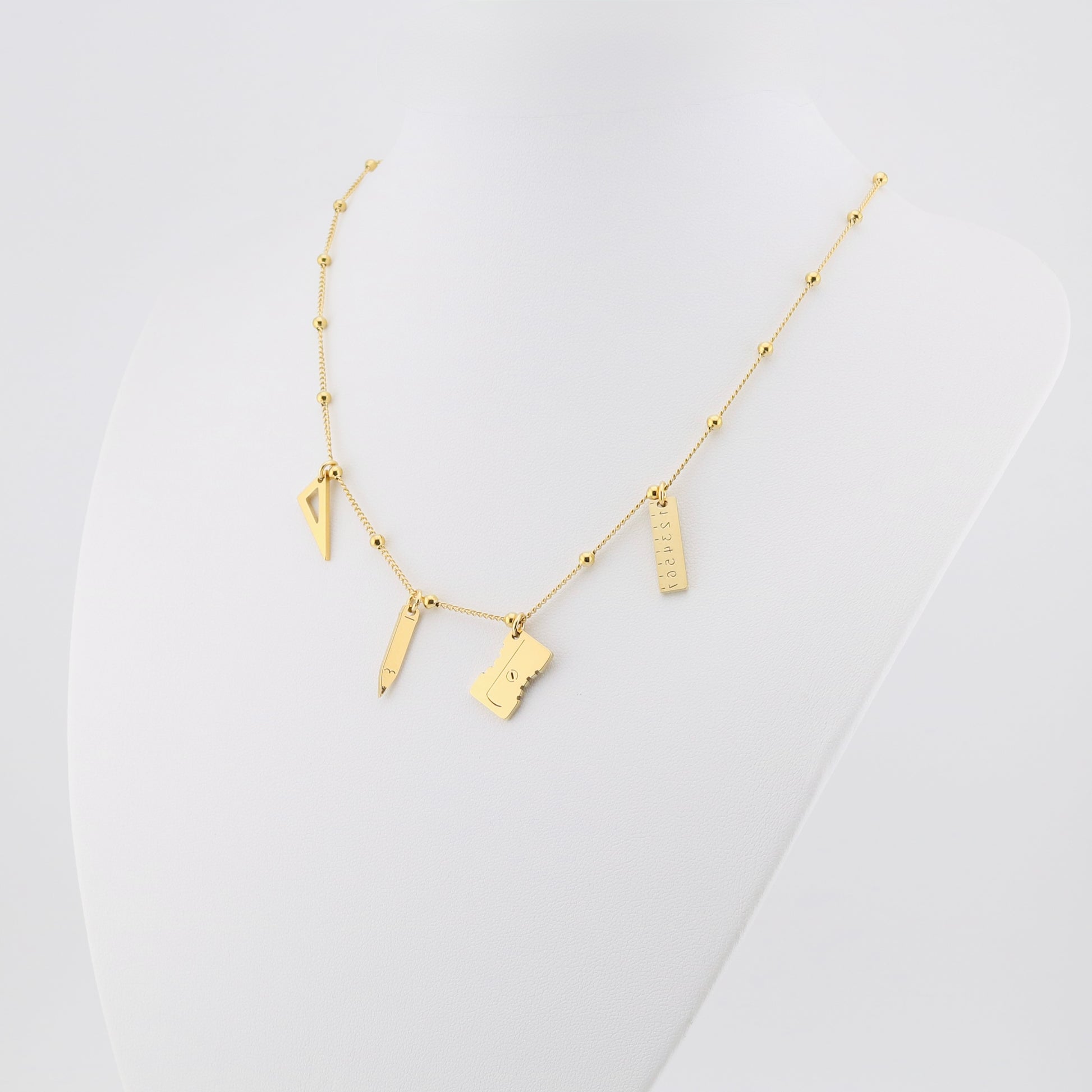 Collar dorado fabricado en acero inoxidable con varios adornos relacionados con el aprendizaje. Lleva cierre de langosta trasero y sus medidas son de 40 cms aprox.