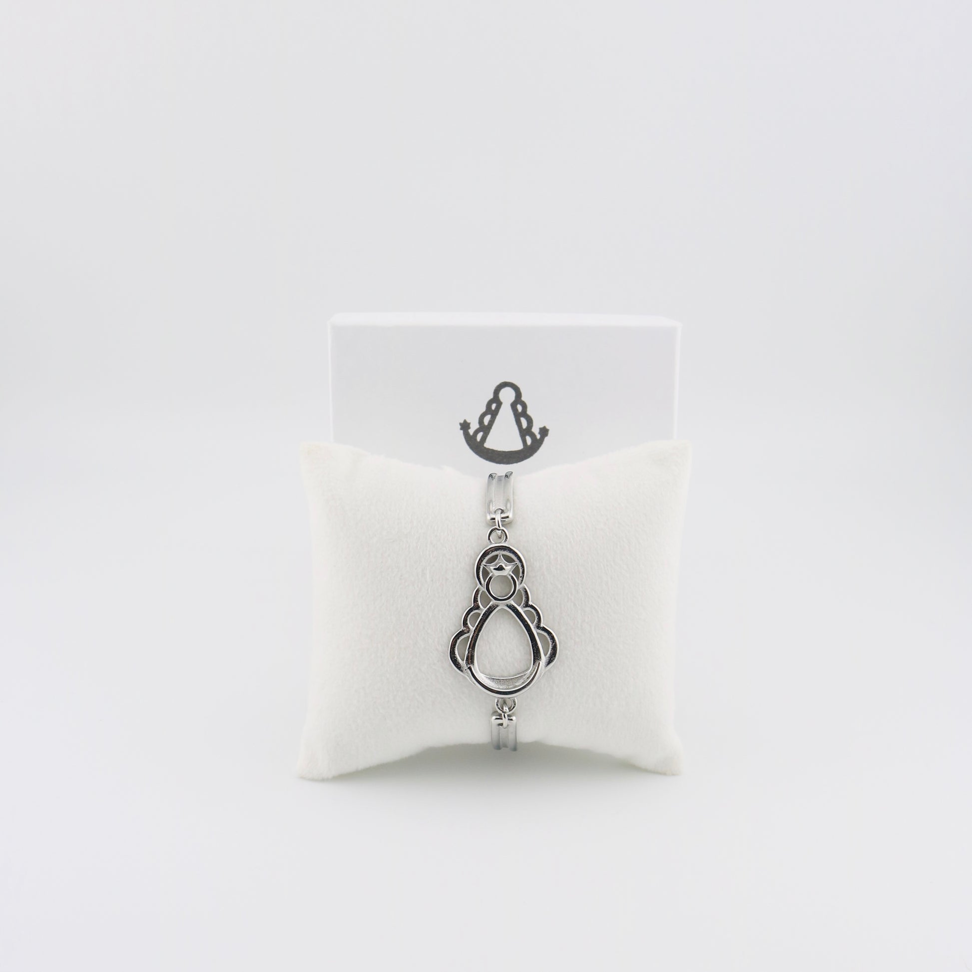Pulsera con silueta de la virgen del Rocío. Lleva cierre de langosta con cadenita de eslabones para ajustártela a tu tamaño. Medida máxima de muñeca 18 cms. Disponible en dos colores.