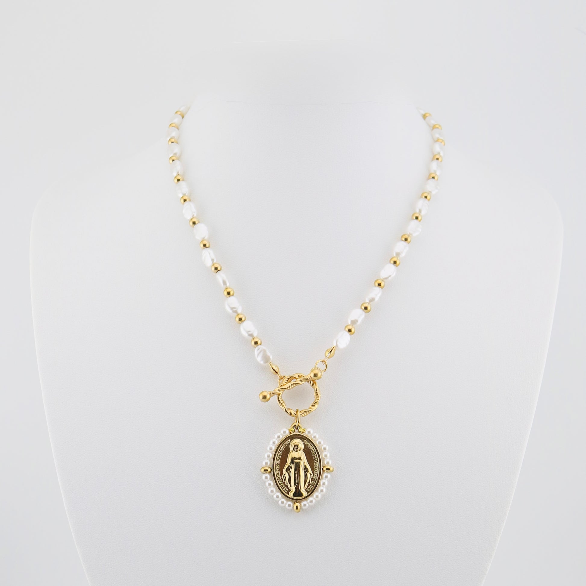 Collar de perlas blancas con adornos en acero inoxidable dorado. Lleva cierre de palanca torcido delantero con medalla de la Virgen de la Milagrosa. Medidas 40 cms aprox.