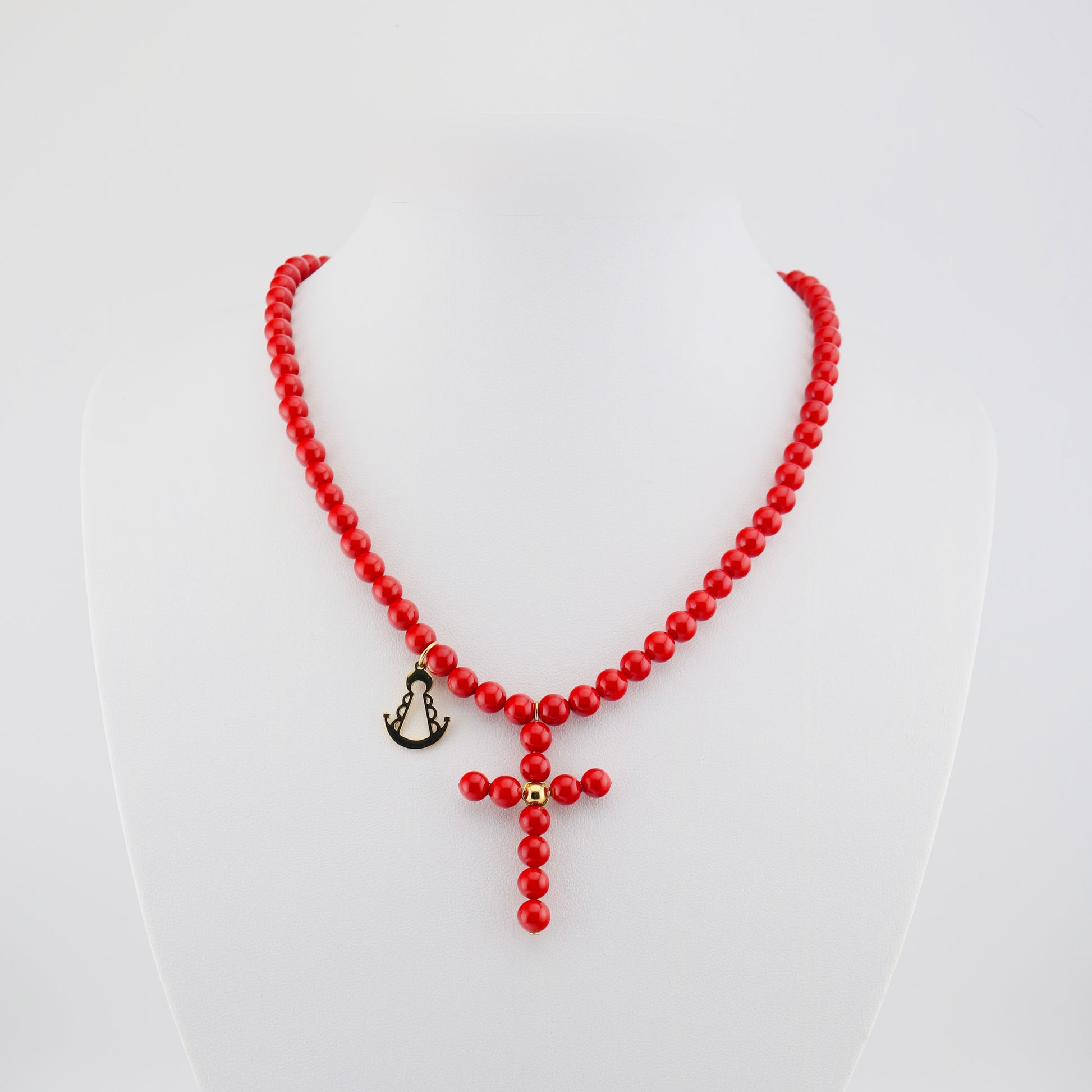 Collar de cuentas rojas con diseño tipo rosario. En el centro, una cruz formada por las mismas cuentas y un pequeño detalle dorado. A un lado, un colgante con la silueta de la virgen del Rocío. Medidas 45 cms aprox. Cierre dorado trasero fabricado en acero inoxidable.