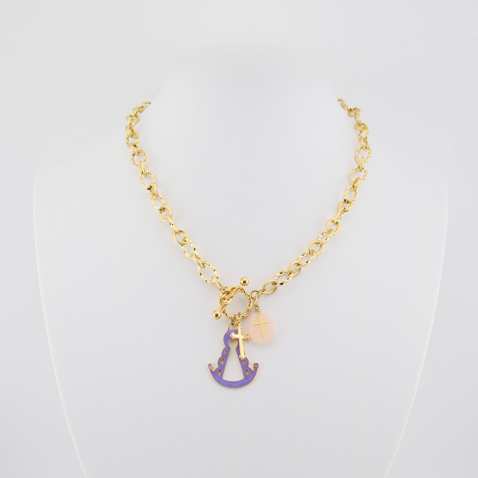 Collar dorado de eslabones torcidos con adornos religiosos y silueta de la virgen del Rocío en malva. Lleva cierre delantero de palanca y sus medidas son de 40 cms aprox.. Material de la cadena: acero inoxidable.