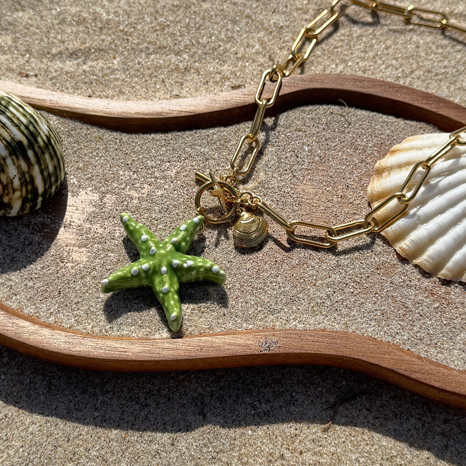 Collar dorado de eslabones fabricado en acero inoxidable. Lleva cierre delantero de palanca con adornos del mar dorados y una estrella de mar verde en cerámica. Medidas 40 cms aprox.