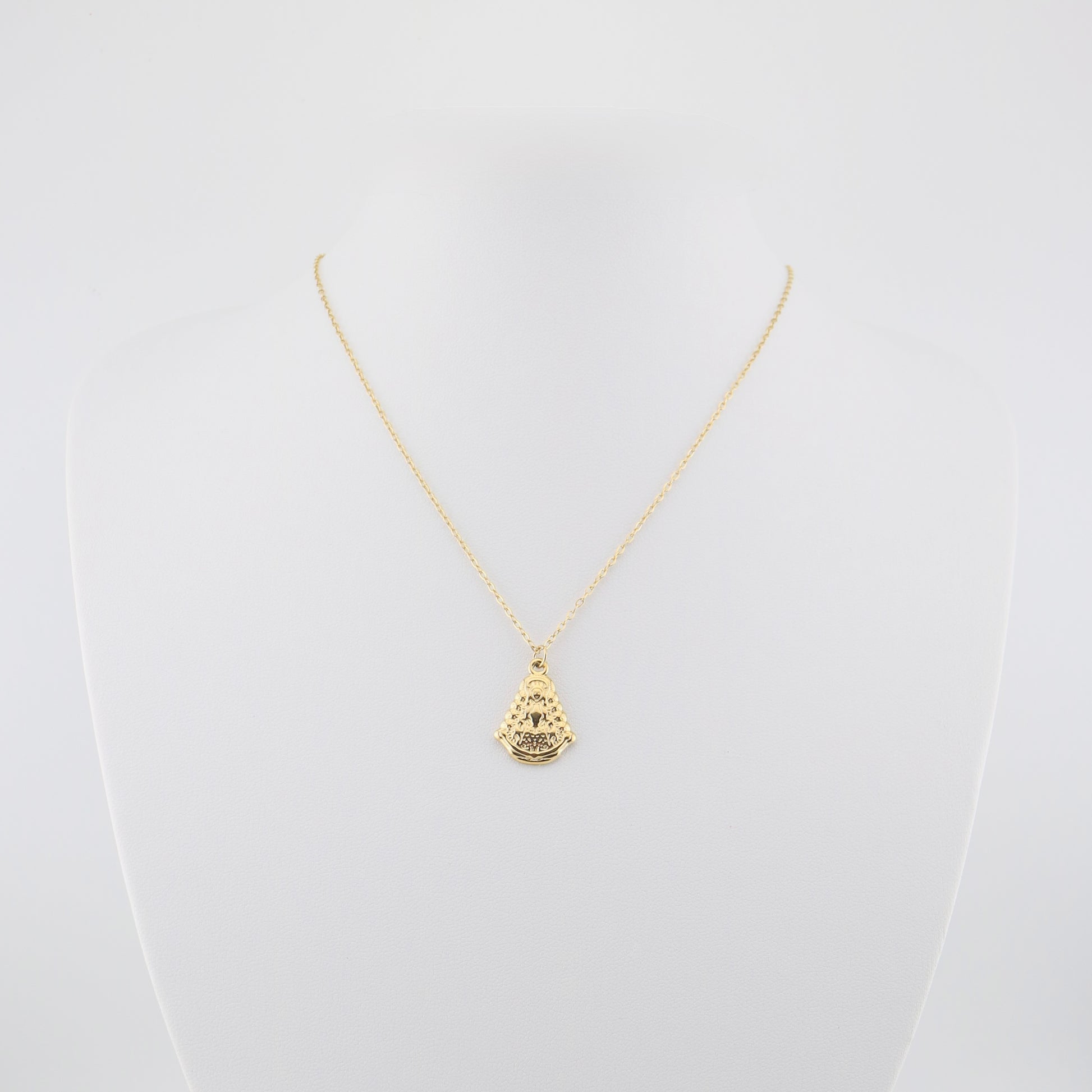 Collar dorado fabricado en acero inoxidable, con un delicado colgante de medalla de la Virgen del Rocío, un diseño atemporal cargado de simbolismo. Largo aproximado de 45 cms, ideal para acompañarte a diario o convertirse en ese detalle especial que completa tus looks con un significado único.