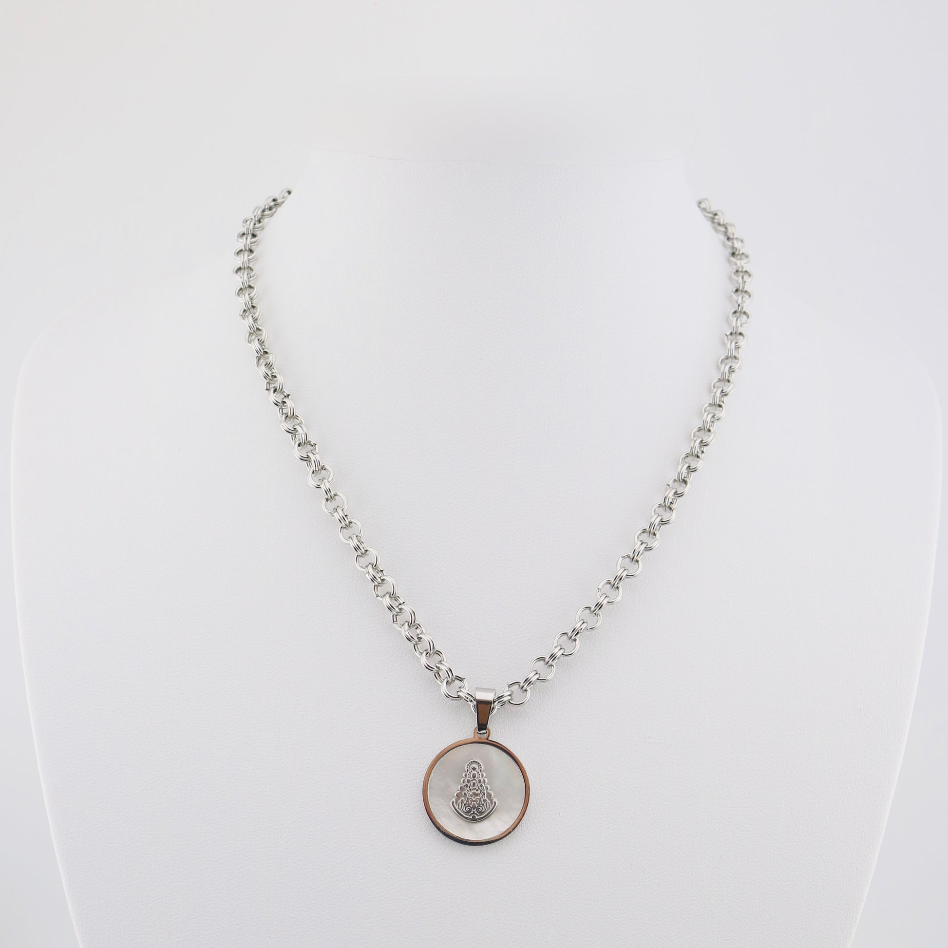 Dorado: collar de perlas con bolitas doradas de acero inoxidable. Lleva cierre de langosta y un colgante de la virgen del Rocío en acero inoxidable. Su medida es de 40 cms aprox.