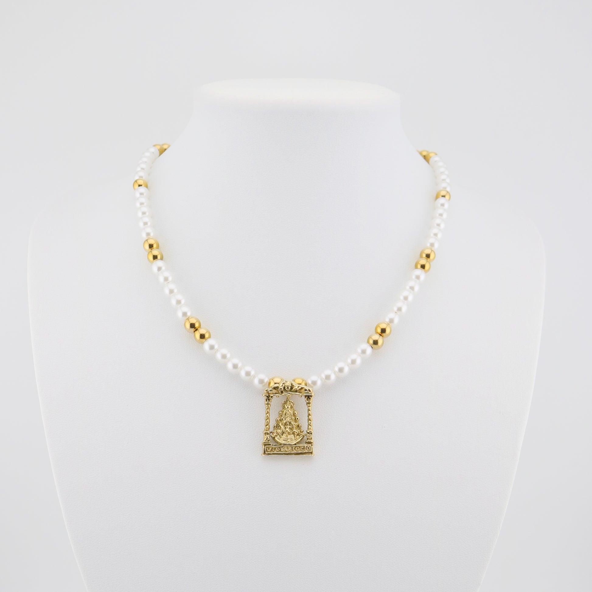 Collar de perlas blancas combinado con perlas doradas de acero inoxidable. Incorpora una medalla con la silueta del paso de la Virgen del Rocío. Fabricado en acero inoxidable y con una longitud aproximada de 40 cms aprox.