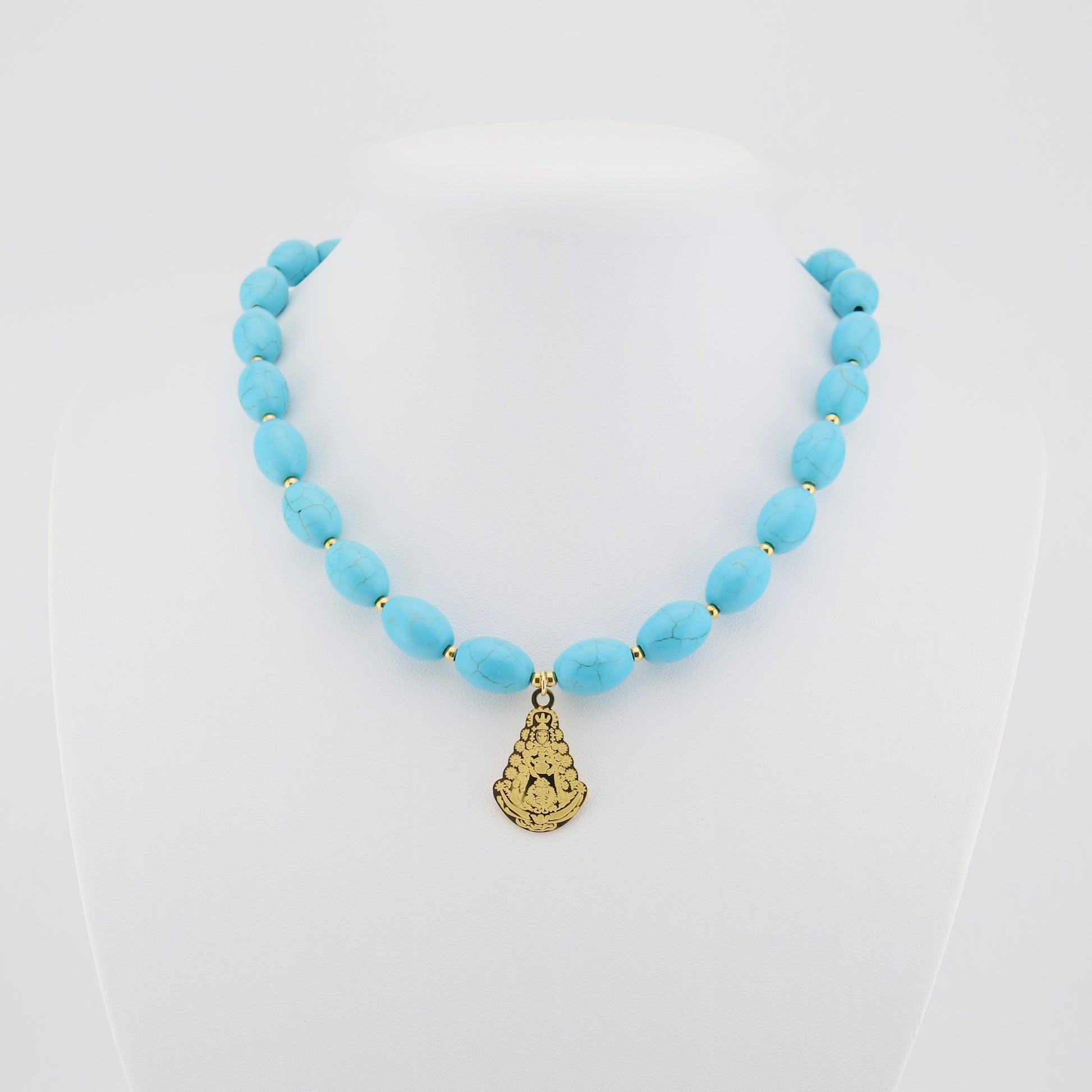 Collar con cuentas grandes ovaladas en tono turquesa y colgante con silueta dorada de la Virgen del Rocío en acero inoxidable. Longitud aproximada: 40 cms.