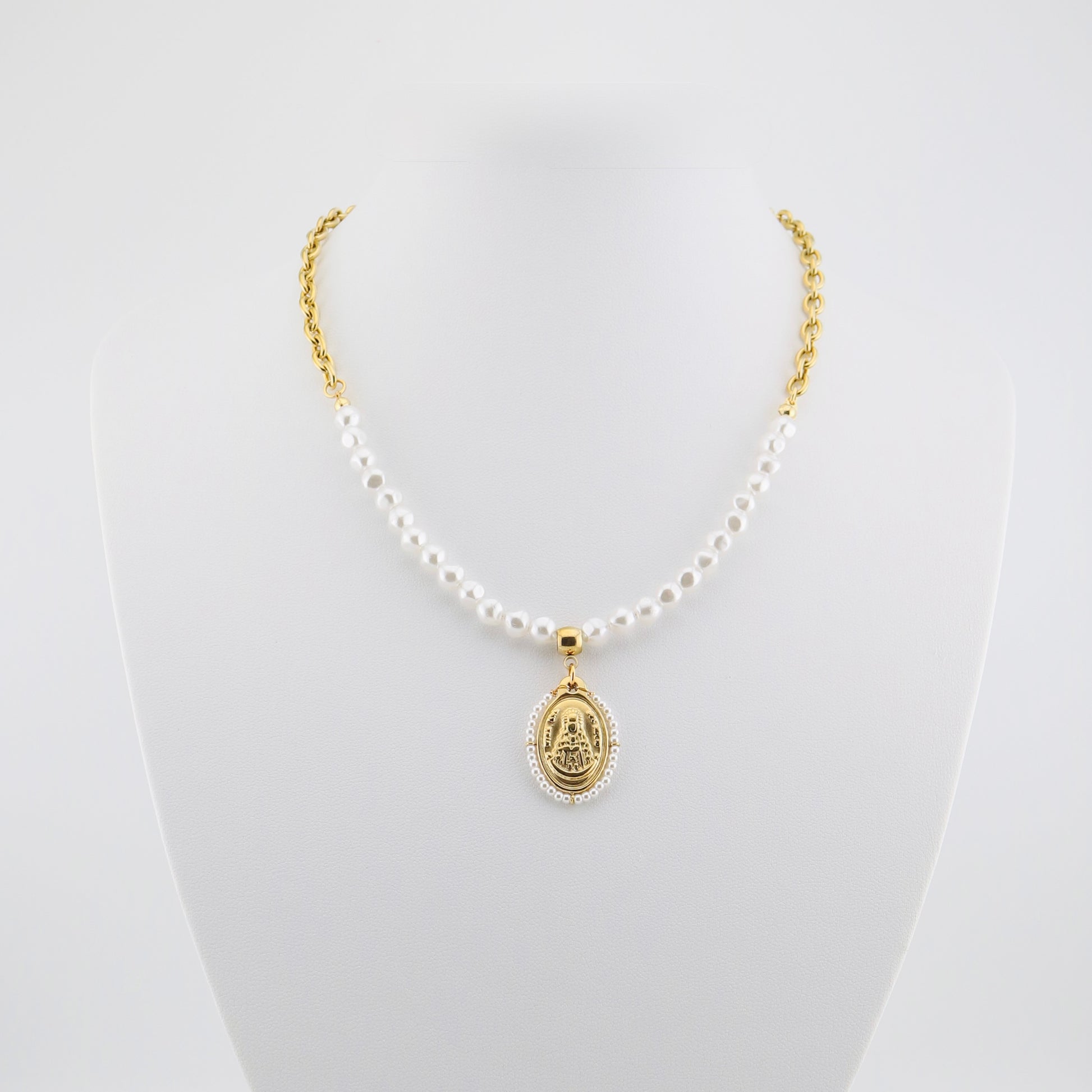Collar de perlas mixto con cadena dorada de acero inoxidable. Lleva como adorno en la parte delantera, una medalla de la virgen del Rocío. Medidas 40 cms aprox.