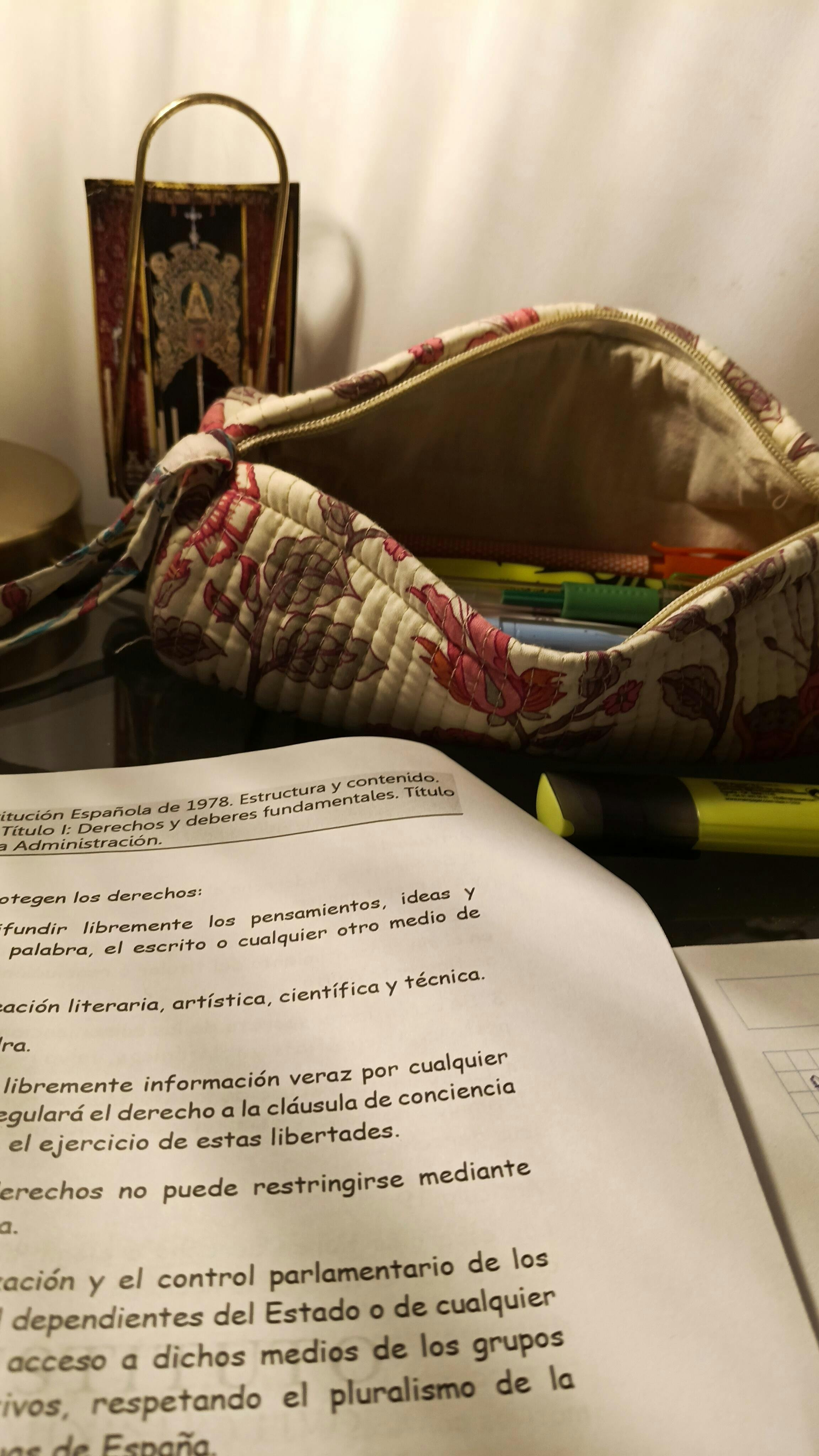 Estuche fabricado en tela de algodón acolchado. Lleva cierre con cremallera y lo puedes usar para llevar tu maquillaje, como minibolsito secundario o como estuche para tus clases. Medidas 24 cms aprox. Disponible en dos colores.