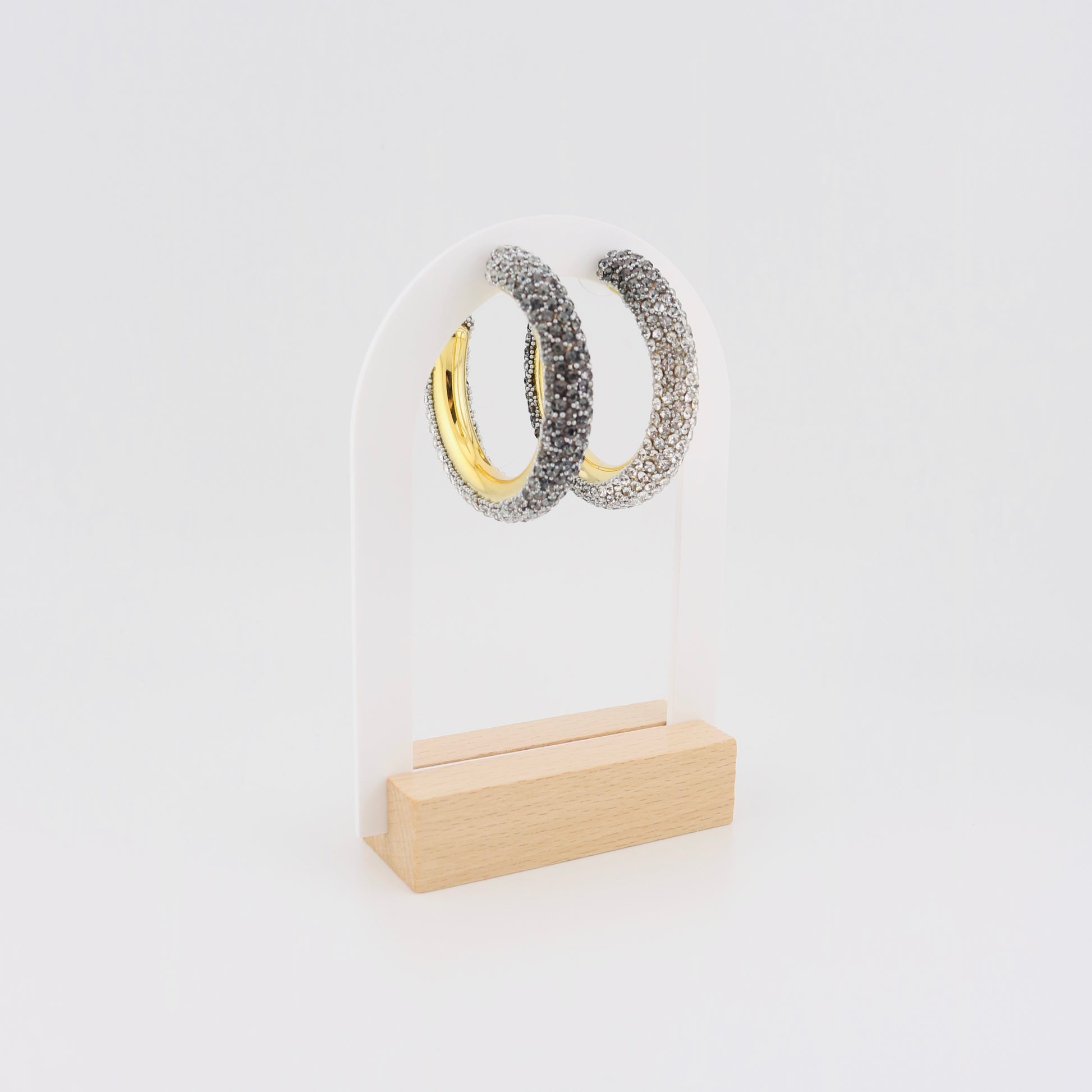 Pendientes en forma de aro con pequeños cristales haciendo un degradado de claro a oscuro. Lleva cierre a presión y su material es chapado en oro. Se vende el par.