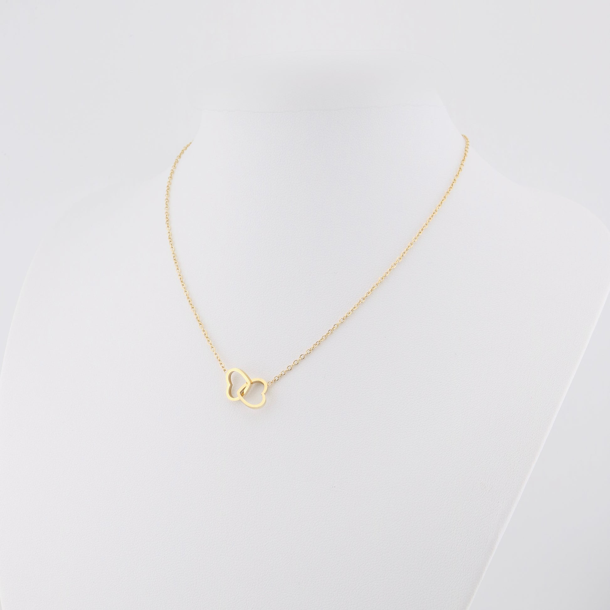 Collar de cadena con dos corazones entrelazados. Fabricado en acero inoxidable. Lleva cierre trasero de langosta y sus medidas son 44 cms aprox.